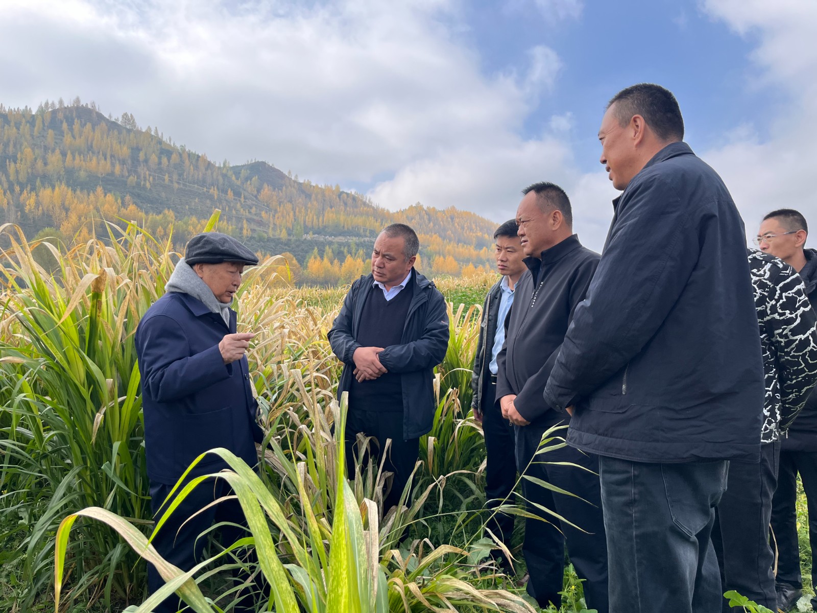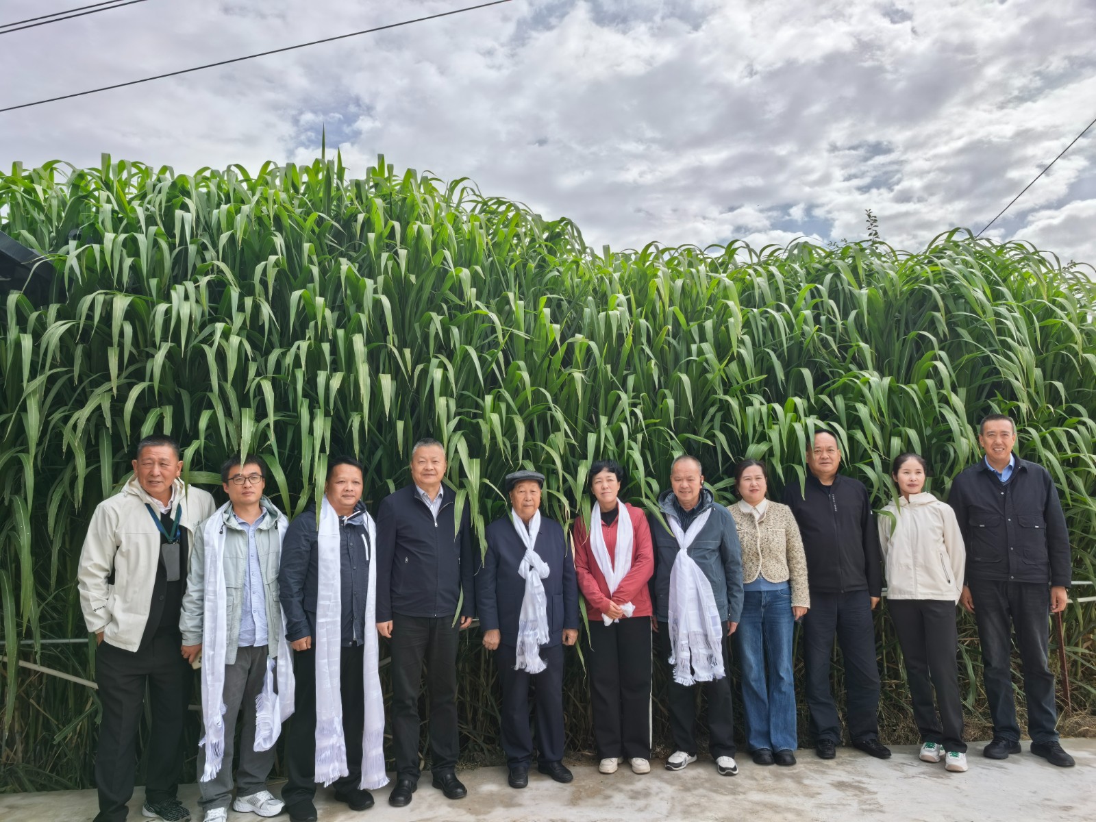 10月12日,林占熺教授一行在市农业农村局等领导陪同下,前往贵德县菌草基地调研。在贵德县德成种植专业合作社,海南州政府副秘书长、州科技局局长谢康勇一行献上洁白哈达。随后,合作社对试验田巨菌草现场测产,三个样地巨菌草株高4.30-4.58 m,折合亩产19-22 t。之后,一行人前往贵德县尕让乡松巴村。2013-2016年,林教授团队曾在此开展巨菌草和“绿洲一号”示范推广,当时亩产达13 t,“绿洲一号”还成功在海拔2160 m处越冬,是青藏高原黄河流域的重大突破。现场一株2014年种植、生长11年的“绿洲一号”菌草株,高达6 m以上、有近百个分枝,引得众人高度关注和评价。